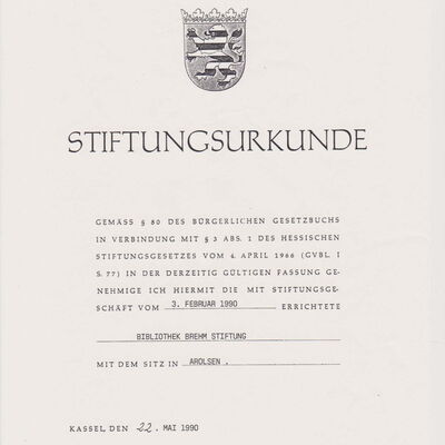 Im Februar 1990 unterzeichneten die Stifter Adolf Brehm und der Landkreis, die gemeinsam erarbeitete Stiftungsverfassung und reichten diese zur Genehmigung bei der Stiftungsaufsicht ein. Der Landkreis/WDV brachte Barvermögen von einer Millionen D-Mark in das Stiftungsvermögen ein, Adolf Brehm seine in 480 Normkartons verpackte Sammlung. Dies waren ingesamt rund 20.000 historische Bücher.