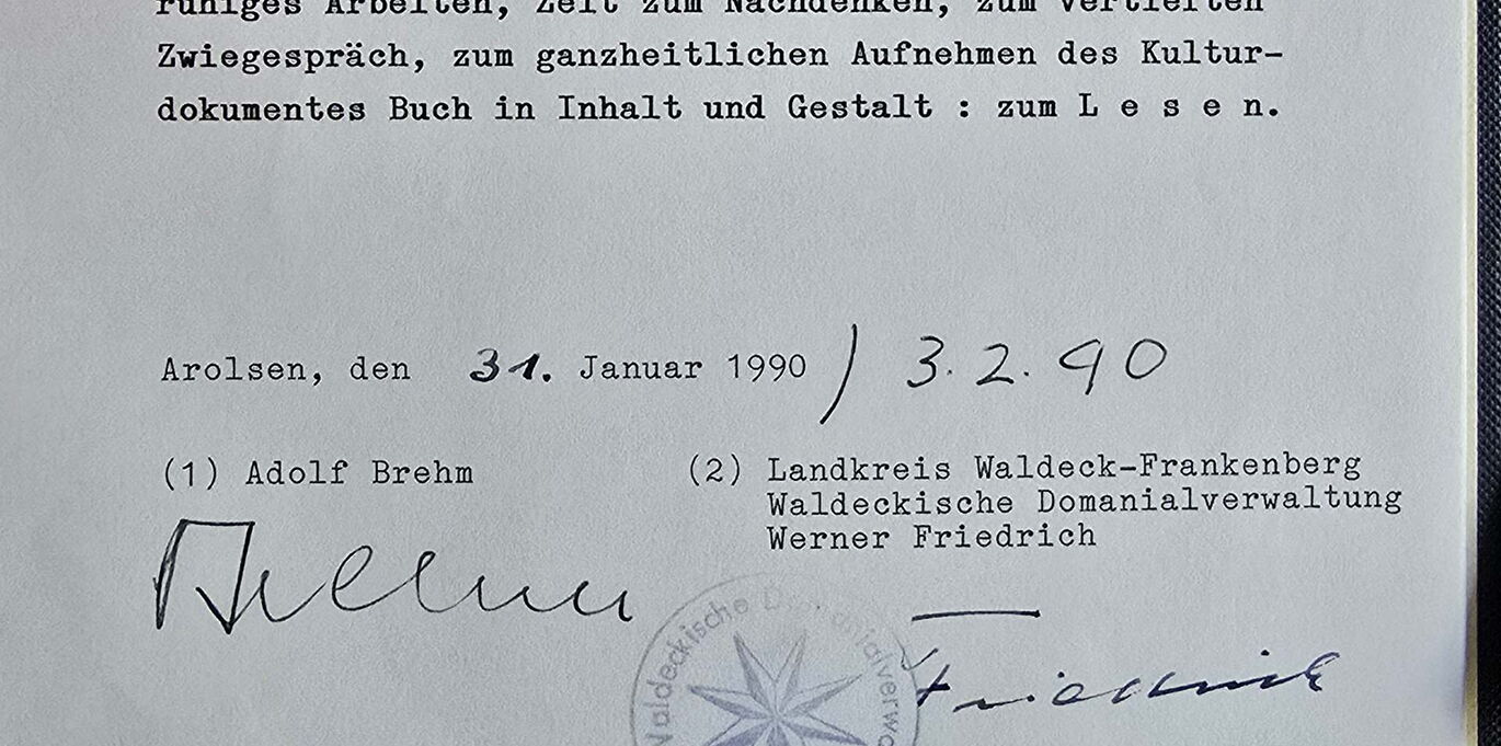 Es wurden Gutachten erstellt, um den ideellen und materiellen Wert der Sammlung festzustellen. Anfang Februar 1990 unterzeichnen Herr Brehm und der damalige Leiter der Waldeckischen Domanialverwaltung Werner Friedrich die Stiftungssatzung. Das Regierungspräsidium in Kassel genehmigt sie am 22. Mai 1990. Nun kann die Errichtung der Bibliothek Brehm im Schloss Arolsen beginnen.