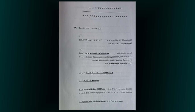 Die ersten vier Hauptzwecke beschäftigen sich mit der Sammlung als solcher. Der Hauptzweck Nr. 1 enthält eine grundsätzliche Regelung: „Der gesamte Buchbestand der Bibliothek Adolf Brehm soll sowohl rechtlich selbständig als auch tatsächlich, in Räumlichkeiten und Platzierung, als geschlossenes ganzes auf Dauer erhalten bleiben und im Gebiete des ehemaligen Fürstentums bzw. Freistaates Waldeck aufgestellt sein.“